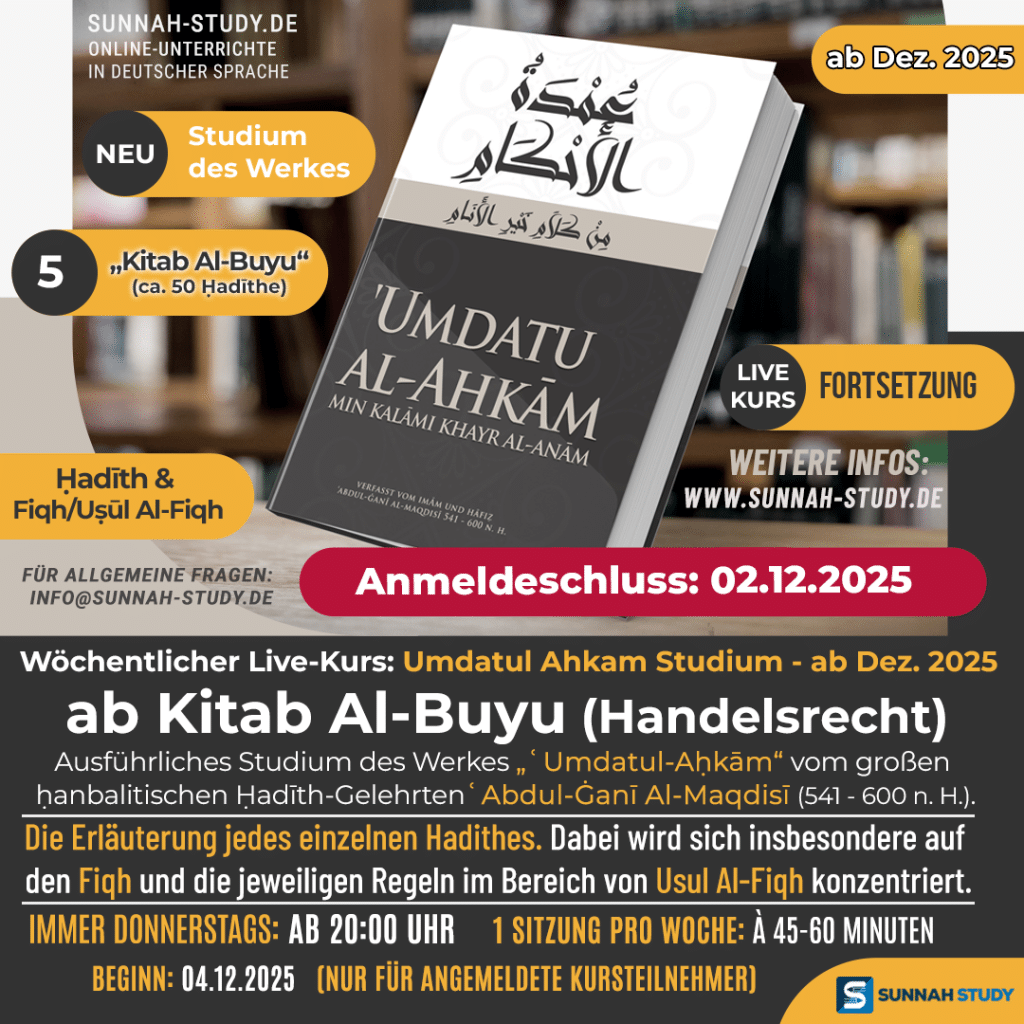Erläuterung von (ab) „Kitab Al-Buyu“ – Handelsrecht (ca. 50 Ḥadīthe) aus dem Werk „ʿUmdatul-Aḥkām“ vom großen ḥanbalitischen Ḥadīth-Gelehrten ʿAbdul-Ġanī Al-Maqdisī (541 – 600 n. H.).